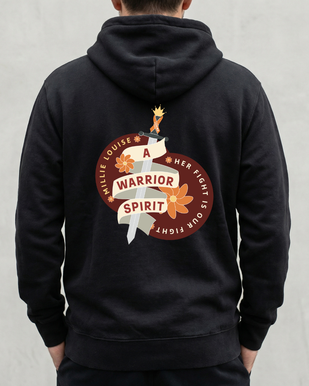 The words “Millie Louise – A Warrior Spirit” declare the faith, courage, and bravery she carries each day